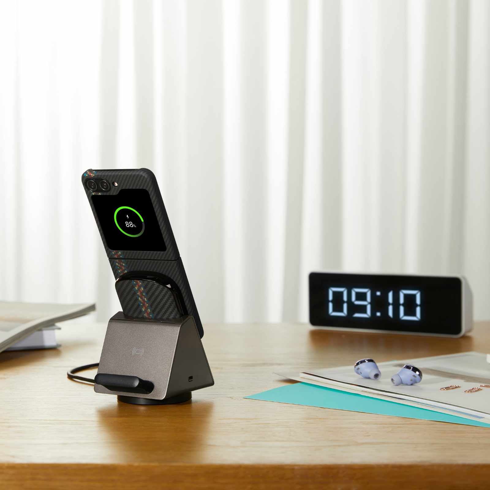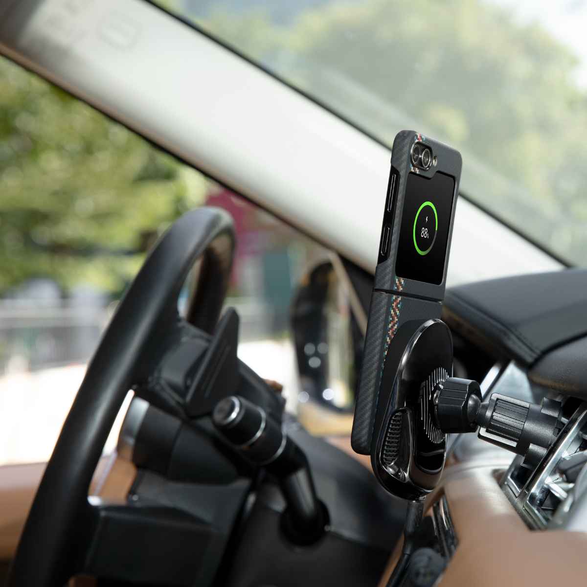 La funda Flip 5 tiene imanes perfectamente alineados que se acoplan al MagEZ Car Mount Pro y al MagEZ Slider 2 compatibles con MagSafe para garantizar una carga inalámbrica estable y rápida mientras conduces.